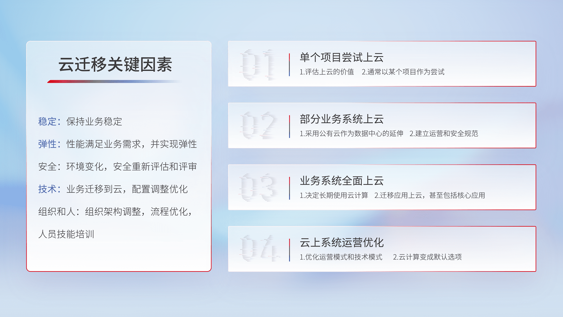 结合实际业务,,从规划设计、、云平台选型、、、、云原生改造、、、数据迁移、、、集成交付,,,,迁移全过程为客户识别最佳上云路径,,,,做好风险识别管理,,设计网络架构、、、身份权限、、、安全审计合规、、、操作审计、、、日志审计、、、监控告警策略、、、多站点容灾设计等,,对云上基础设施进行整体规划,,,,提升IT治理水平,,,以满足弹性、、高可用、、高性能的需求。。