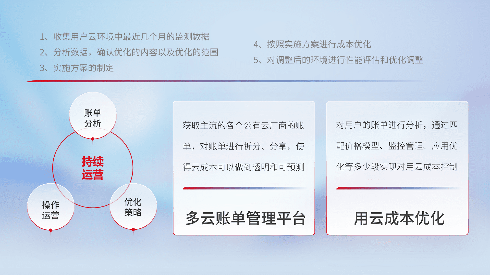 通过多云纳管,,,以统一的资源数据模型把客户的云资源进行抽象和封装,,,进而实现对多云资源的统一操作,,保障云资源管理的可靠性、、稳定性与可用性。。。。量身定制化运维内容,,,,配置、、、、开发运维、、、、补丁管理、、、备份、、、监控、、、、认证和访问管理、、审计和日常巡检等,,,,保障在用云过程中的可靠度,,稳定度以及高可用率。。。。